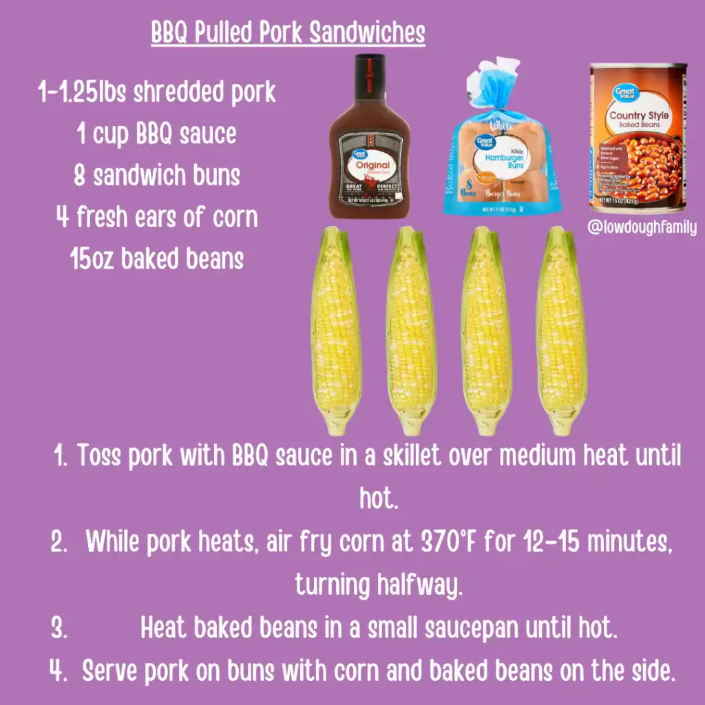 Tender pulled pork tossed in tangy BBQ sauce and piled high on soft buns, served with sweet corn on the cob and savory baked beans for a true BBQ plate. Swap the corn for air fryer potato wedges or a fresh garden salad, and the beans for coleslaw if you want something lighter.