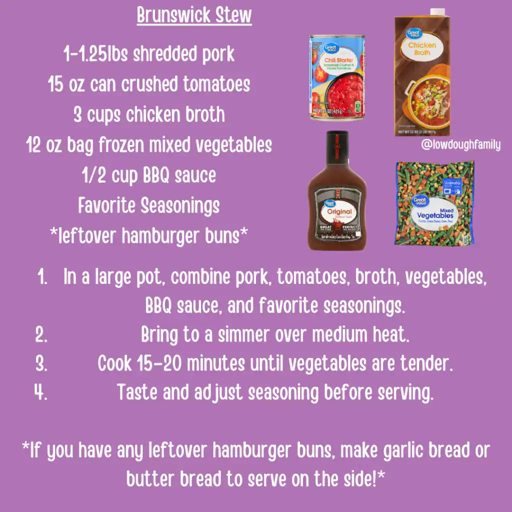 A hearty Southern-style stew loaded with pulled pork, mixed vegetables, crushed tomatoes, and a touch of BBQ sauce for richness. You can swap in chicken instead of pork, or use fresh vegetables if you have them on hand.
