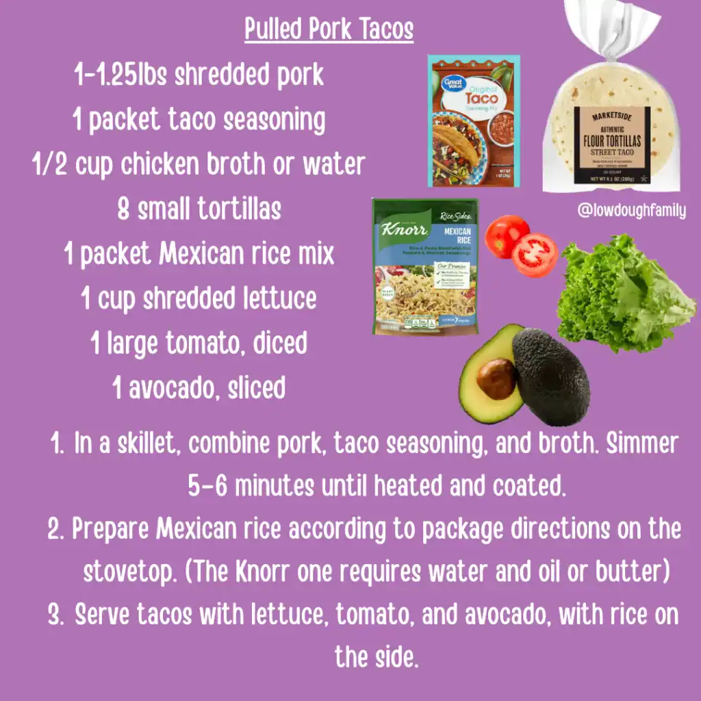Seasoned pulled pork tucked into soft tortillas, topped with crisp lettuce, juicy tomato, and creamy avocado, with Mexican-style rice on the side. Swap the toppings for pico de gallo, shredded cheese, or grilled peppers and onions for a flavor twist.