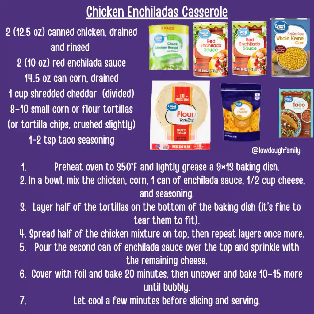 This cheesy, saucy dinner brings all the enchilada flavor with half the work! You can use corn or flour tortillas (or even crushed tortilla chips) and add in black beans or canned tomatoes/salsa to make it stretch even further.