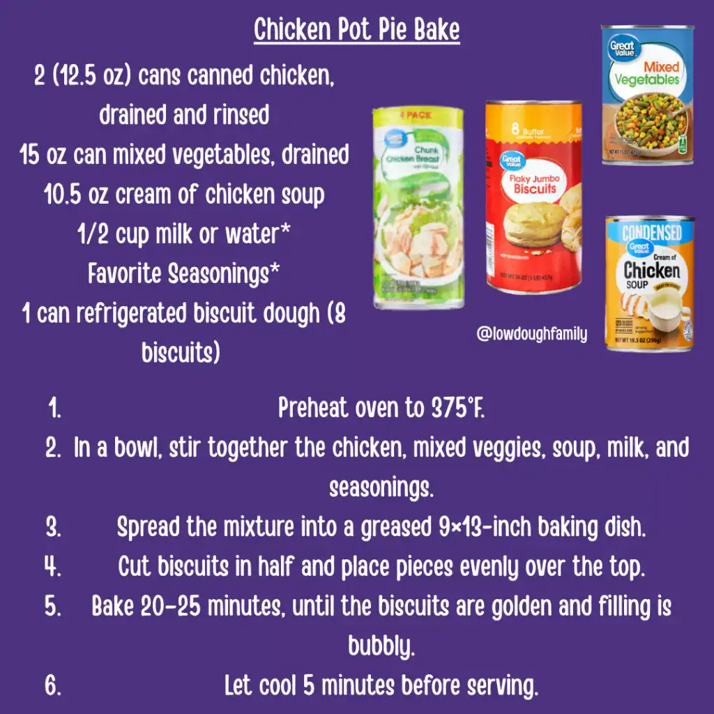 This cozy meal is the definition of comfort food. It’s creamy, hearty, and filled with veggies. You can swap canned mixed vegetables for frozen ones or even leftover cooked veggies, and any cream-style soup works if you’re out of cream of chicken.