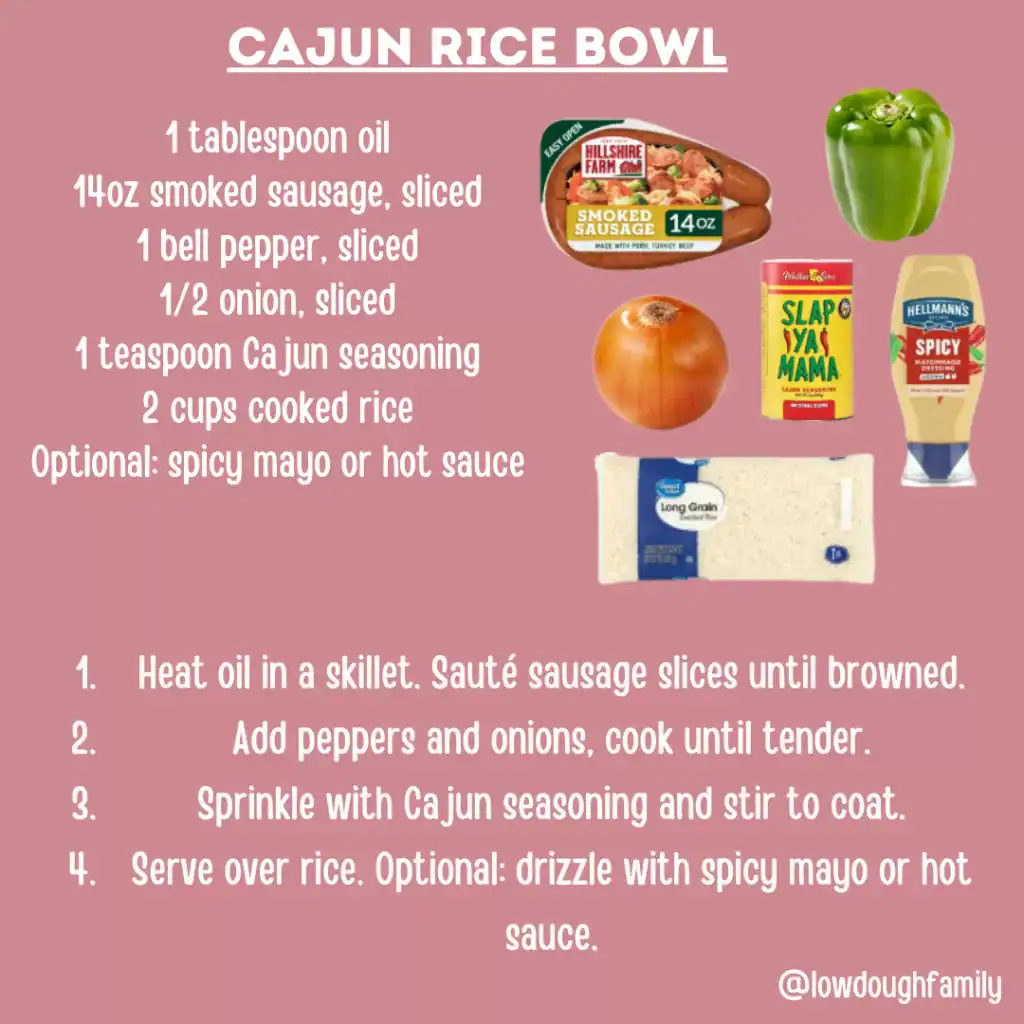 Smoked sausage, peppers, and onions get a flavor boost from Cajun seasoning, making this bowl spicy, savory, and satisfying. You can dial up the heat with hot sauce or tone it down with a drizzle of ranch. Try frozen peppers and onions to save time too!