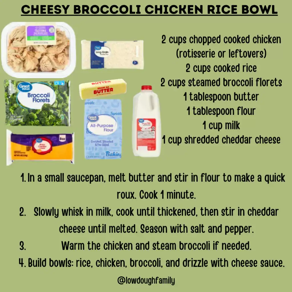 Comfort food in a bowl! Tender chicken and broccoli are smothered in a quick cheddar cheese sauce and served over warm rice. Swap in cauliflower or frozen mixed veggies if that’s what you have, and rotisserie chicken or leftovers make this come together fast.