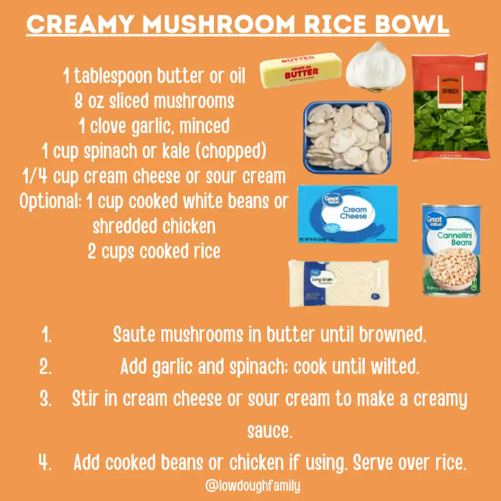Sautéed mushrooms in a creamy garlic sauce with spinach or kale make this bowl feel cozy and elevated. Swap the spinach for frozen greens to keep things simple.