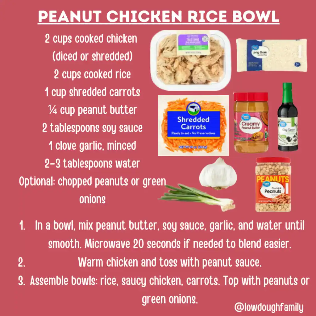 A creamy peanut sauce turns basic chicken into something crave-worthy when paired with shredded carrots and rice. You can use rotisserie chicken, tofu, or even frozen meatballs, and add chopped peanuts or green onions for extra texture.