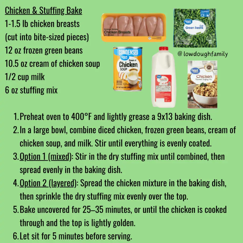 This cozy, one-pan dinner is creamy, filling, and perfect for busy nights when you don’t want to pre-cook anything. You can swap green beans for broccoli or mixed veggies, and chicken thighs work great here if they’re cheaper.