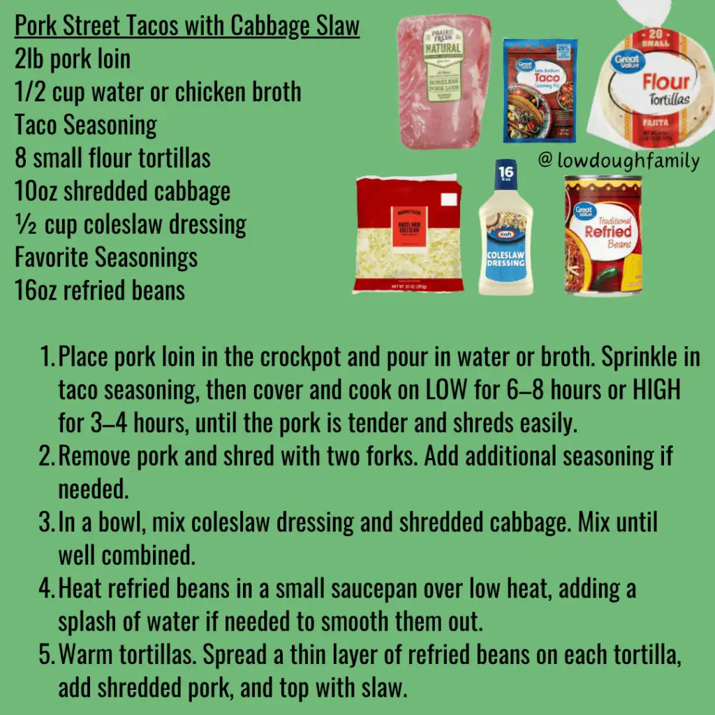 Tender crockpot pork paired with crunchy slaw and creamy refried beans makes these tacos feel like a complete meal. Try adding a splash of lime or a spoonful of salsa for extra brightness, or use corn tortillas if that’s what you have.