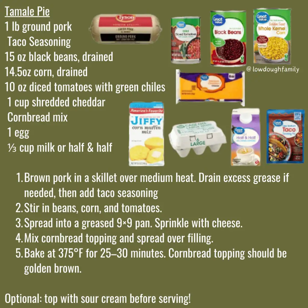 Seasoned ground pork layered with beans and corn, topped with fluffy cornbread for a hearty, budget-friendly bake. Ground turkey works just as well, and you can stir in a little salsa or top with sour cream for extra flavor.