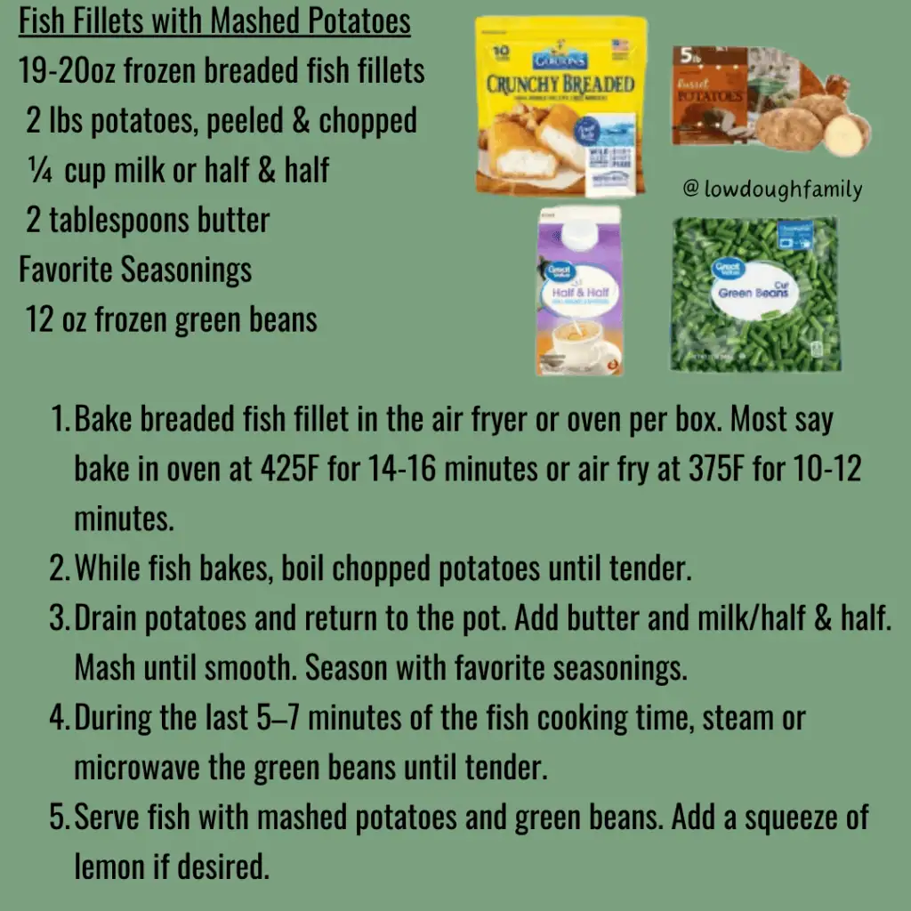 Crispy breaded fish served with creamy mashed potatoes and simple green beans for a classic comfort plate. Add lemon or a quick tartar sauce (mayo + pickle relish) for extra flavor, or swap green beans for peas if needed.