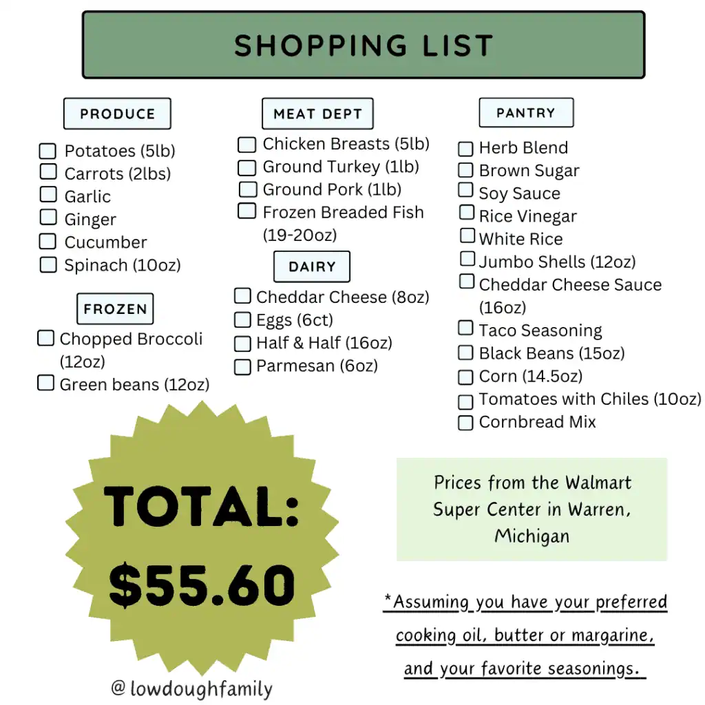 This week’s 6 Dinners Under $60 meal plan comes in at just $55.60 from the Walmart Super Center in Warren, Michigan, and that total includes a lot of basic pantry-style ingredients. We’re talking items like rice, seasonings, cornbread mix, soy sauce, and half & half that many of you may already have on hand. That means your final total could easily come in lower than mine, depending on what’s already in your kitchen.