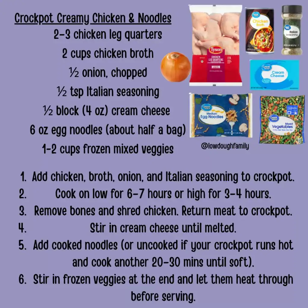 This is the ultimate comfort meal on a budget. Slow-cooked chicken, creamy sauce, and tender noodles come together in one pot for a filling family dinner. You can even sneak in some frozen veggies to make it a one-bowl wonder!