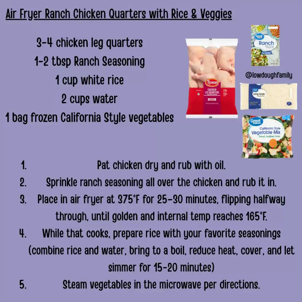 Crispy, juicy chicken leg quarters seasoned with ranch and cooked to perfection in the air fryer and no oven required! Paired with simple rice and veggies, it’s a full plate of flavor with minimal fuss.