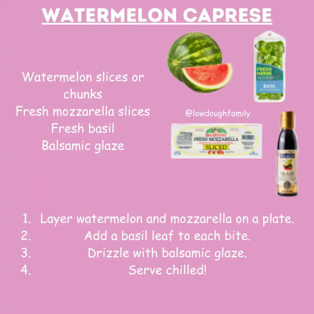 A fun twist on the classic with juicy watermelon, creamy mozzarella, and basil drizzled with balsamic glaze.